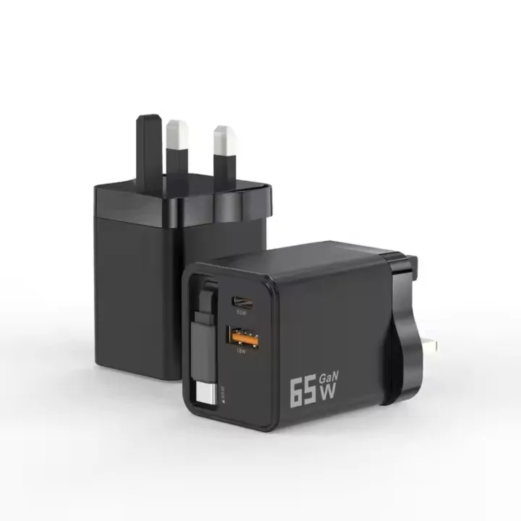 65W GaN Fast Charger | 3-in-1 Wall Adapter with Built-in USB-C Cable